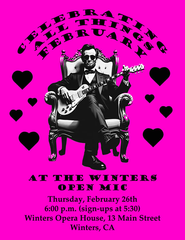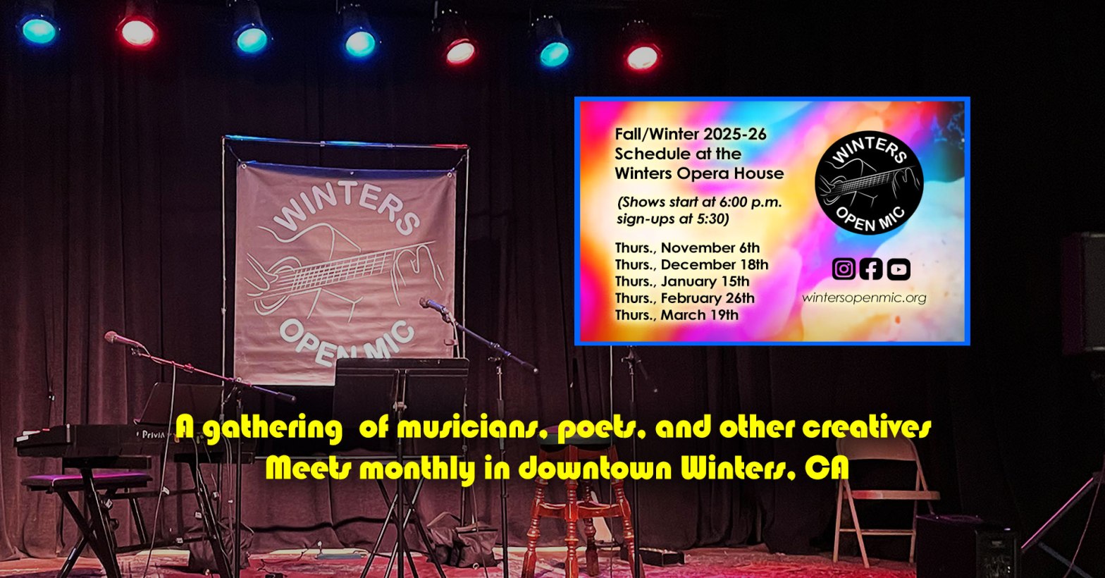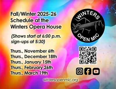 Our next show will be on Thursday, January 15th! For our January show we’ll be inside the historic Winters Opera House at 13 Main Street. The show starts at 6:00 with signups at 5:30. As always, all are welcome.