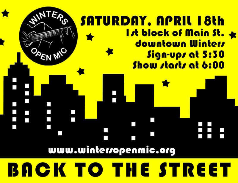 For next show will be BACK ON THE STREETS! THAT’S RIGHT! The Winters Open Mic will be returning to the streets on Saturday, April 18th! The event will take place outdoors, on the first block of Main, in Downtown Winters. Spring is here, so come on down and dance in the street to some great music! Show starts at 6:00; sign-ups for performers begin at 5:30.